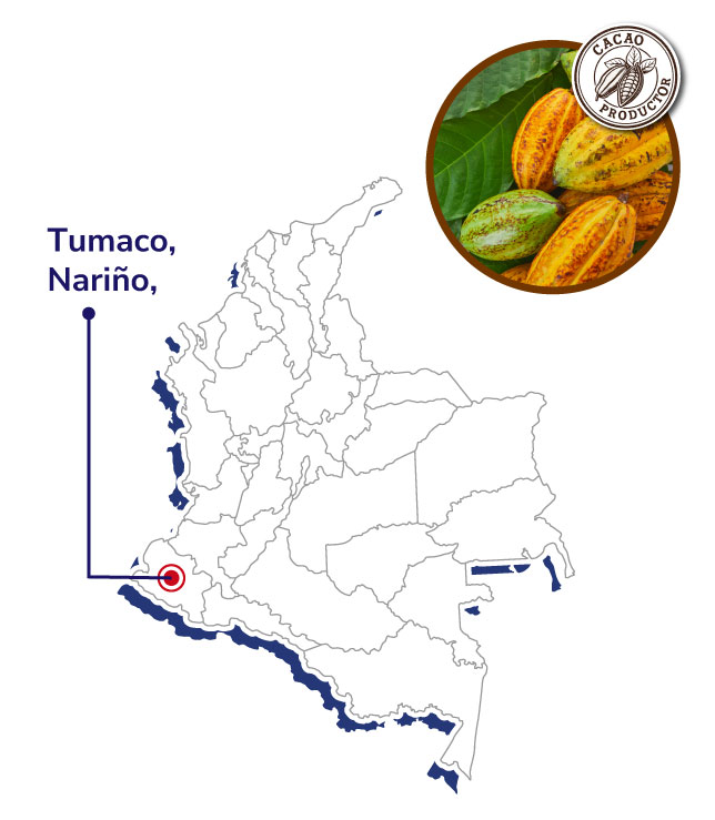 Calidad del cacao de Tumaco: El cacao cultivado por ASOMUJE en la región de Tumaco es reconocido por su alta calidad y perfil sensorial único, resultado de las condiciones excepcionales del Pacífico colombiano: altas precipitaciones, suelos aluviales ricos y humedad constante, que favorecen una fermentación natural y equilibrada. Su cacao fino de aroma, predominantemente Trinitario con herencia Criolla, presenta notas frutales, florales y de nuez, con acidez baja y textura sedosa, ideal para la industria chocolatera gourmet y de exportación.